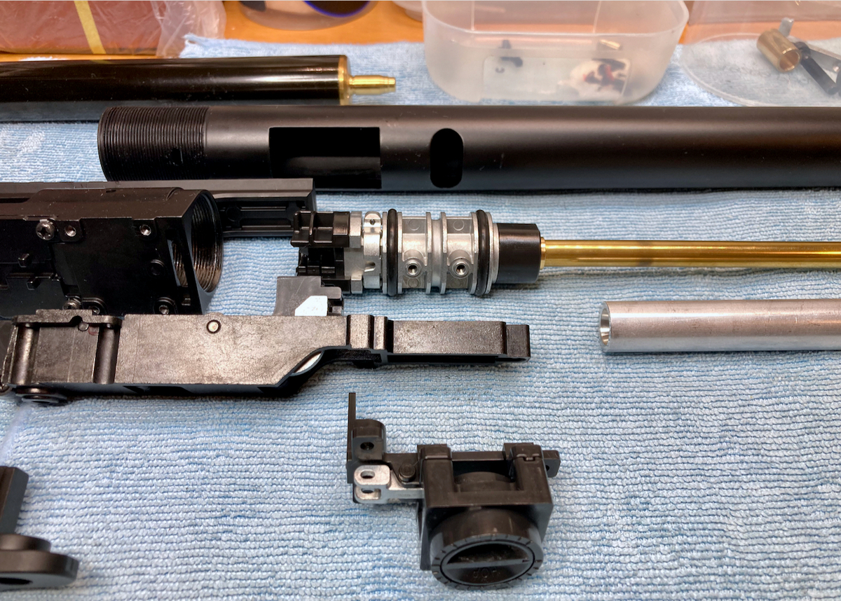 野外での精密射撃・的射ちにご使用の予定。出力は規制値の上限付近まで上げ、BB弾は0.28g~0.32gを長距離まで飛ばせるようホップの調整範囲を広げます。ピストンにエアブレーキロッドを付け加えて打撃音が出ない静かな銃にします。