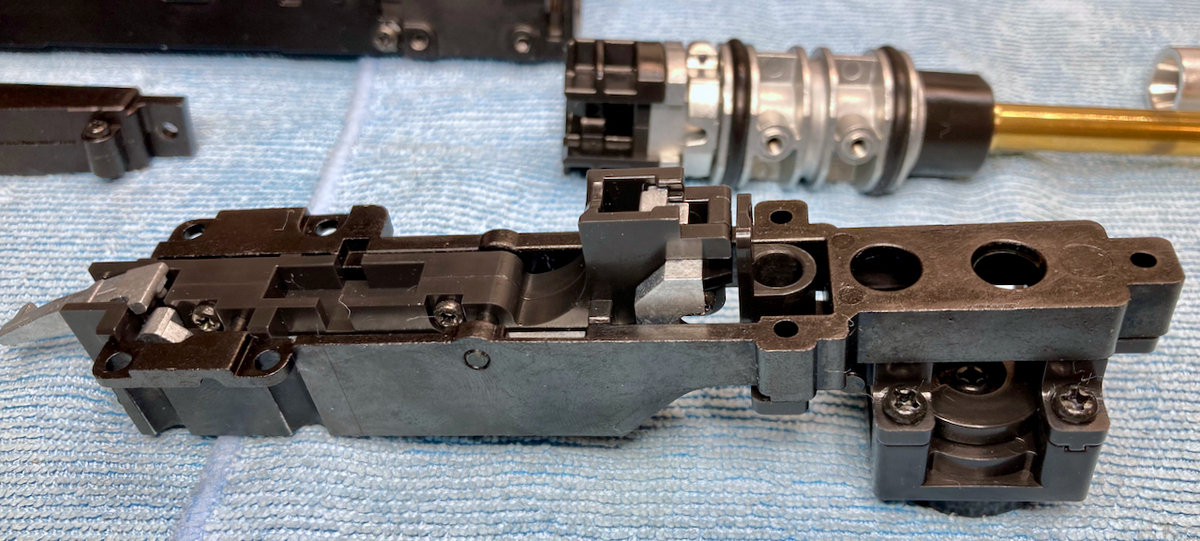 M40A5はシリンダー・ピストンが短いため、純正のスプリングにスペーサー(6mm程度が限界)を追加しても出力不足です。スプリングはややレートが高い良質な日本製のものに交換し、ノズル内径で出力調整します。