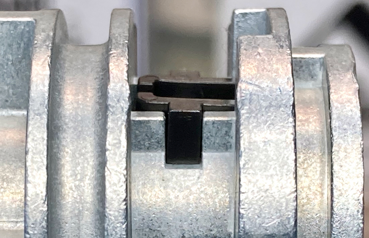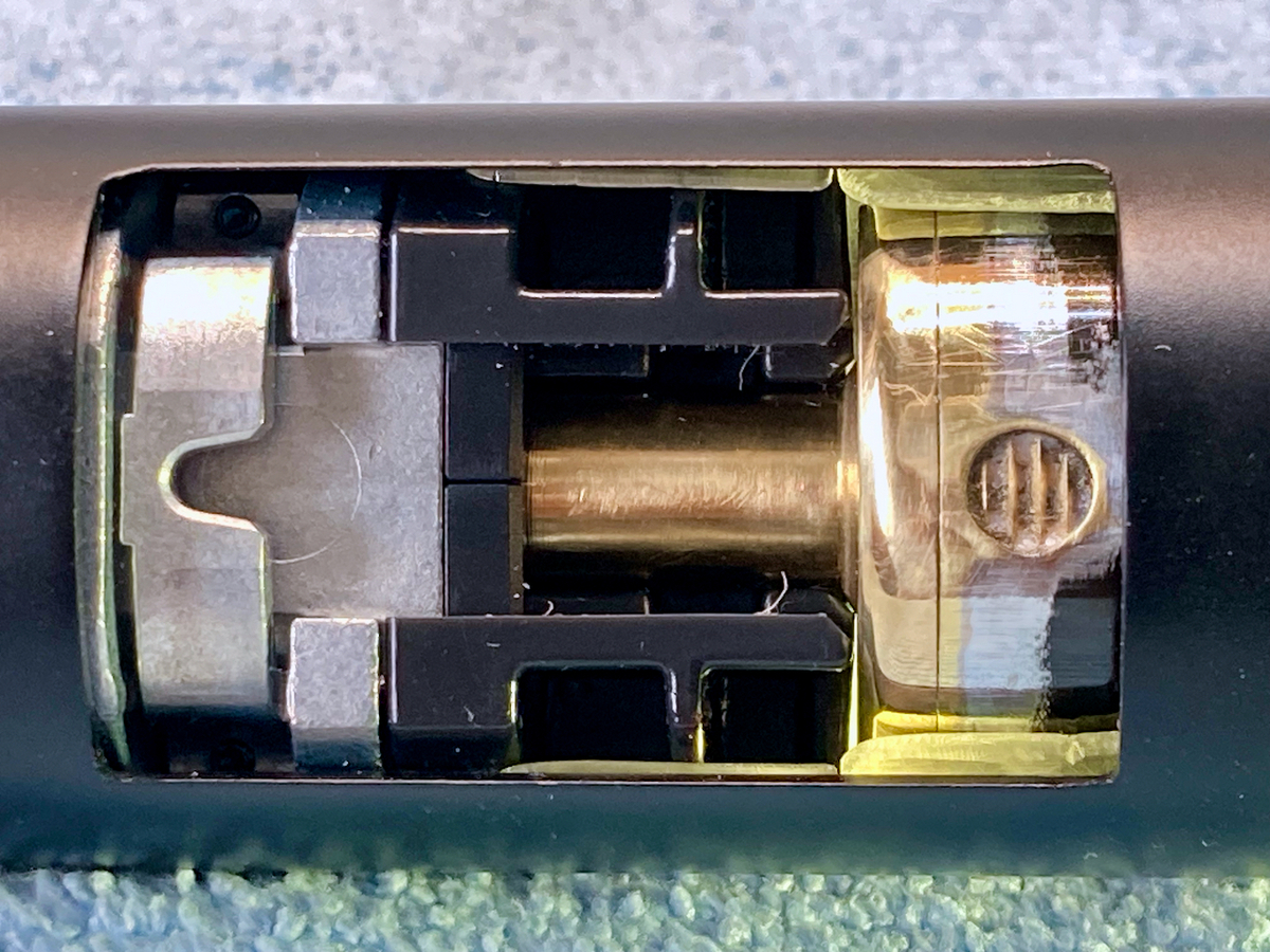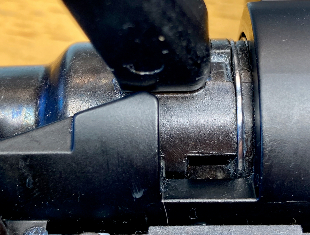 ボルトハンドル部には3つの機能があります。ハンドルロック、コッキングインジケーター、トリガーロック。完全に前進させないとボルトハンドルは降りません。