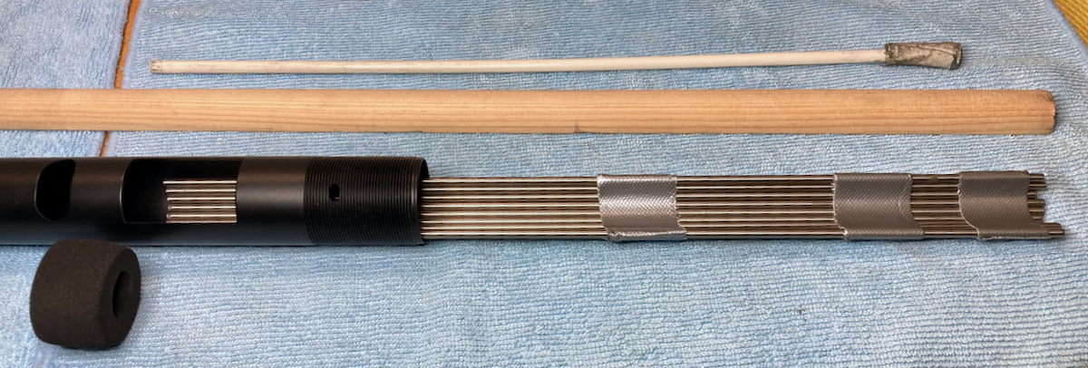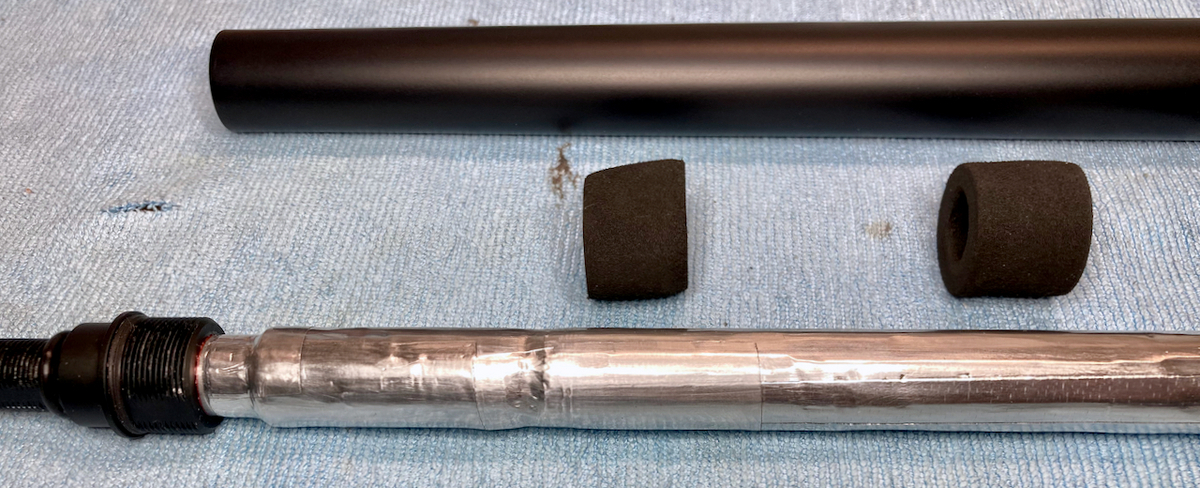 M40A5はアウターバレルが完全にフリーフロート(レシーバーにネジ込んである部分以外はどこも固定されていない)です。チャンバー・インナーバレルはОリングを介してアウターバレル内に位置決めされています。前後方向にズレないように、レシーバー下部から伸びているフレームにピラーを介してチャンバーが繋がっています。この固定は前後と回転方向の位置決めだけに働いている印象です。チャンバーとインナーバレルがアウターバレル内でもう少し安定するよう加工します。アウターバレルもストック先端付近をべディングで固定してもいいかもしれません。