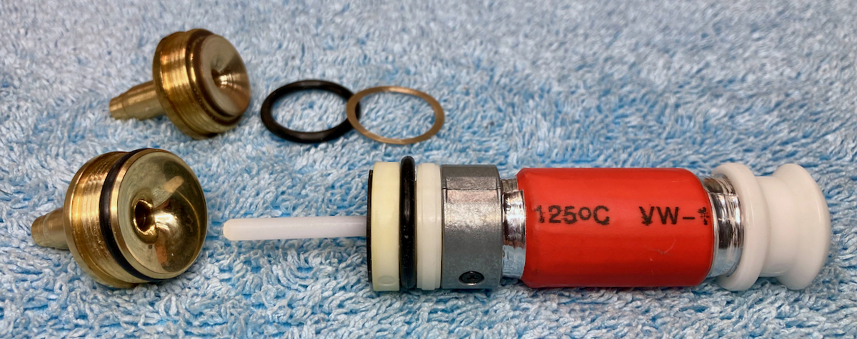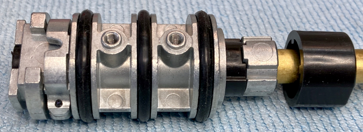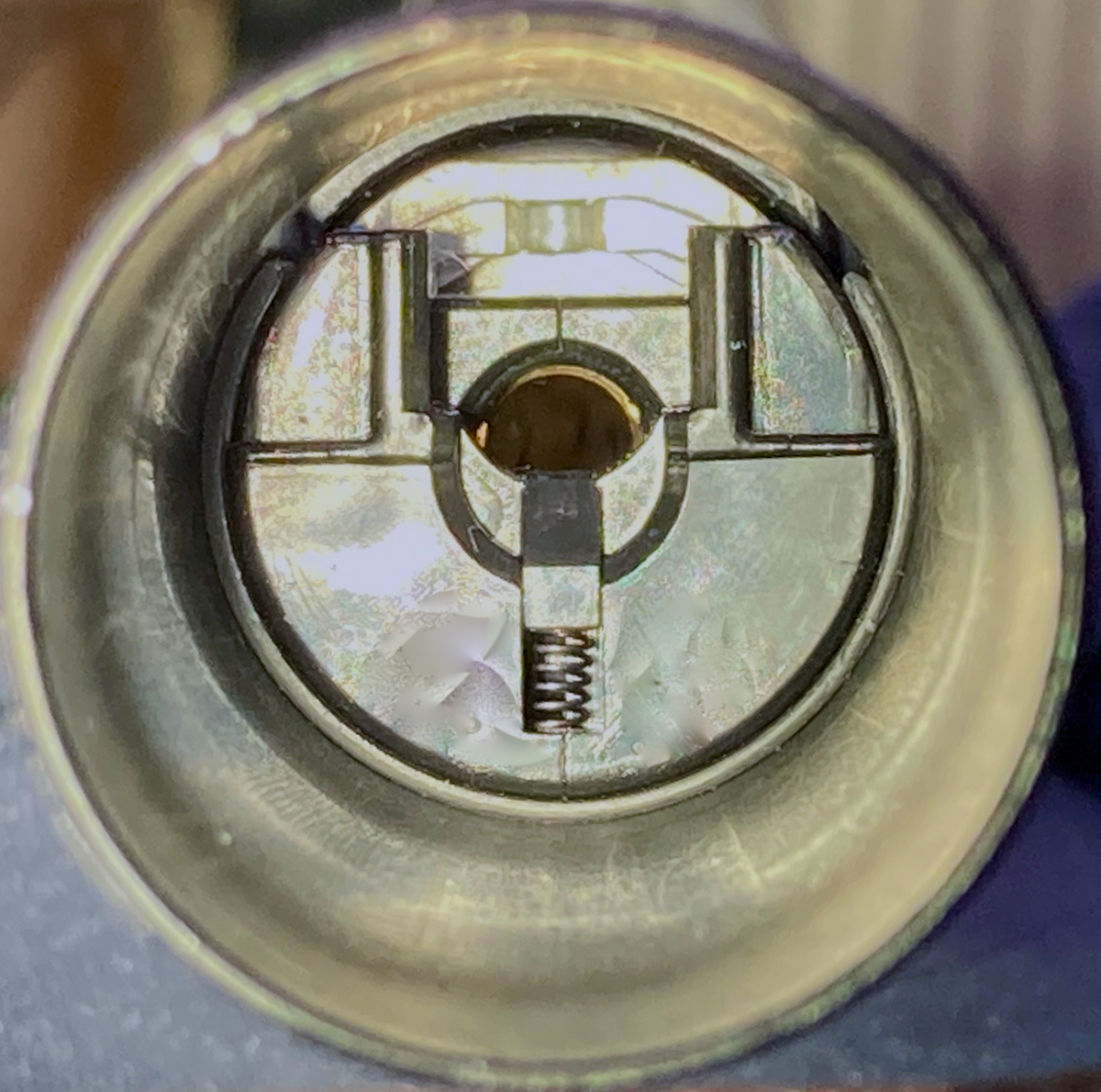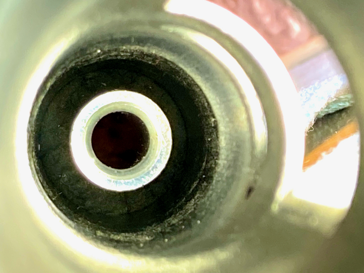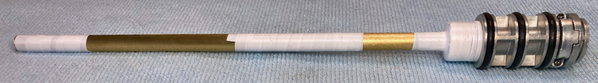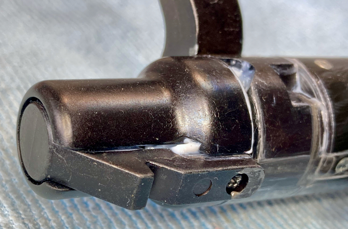 発射時にボルトエンドを指で前方に強く押していると弾速が2m/sほど上がっていたので、約0.5mm厚に削り出したワッシャーをボルトハンドル前方とシリンダーの間に挟みました。このことで出力の変動は無くなりましたが、ボルトハンドルロックの機能は働かなくなっています。また、ハンドル閉鎖時に少し抵抗があります。