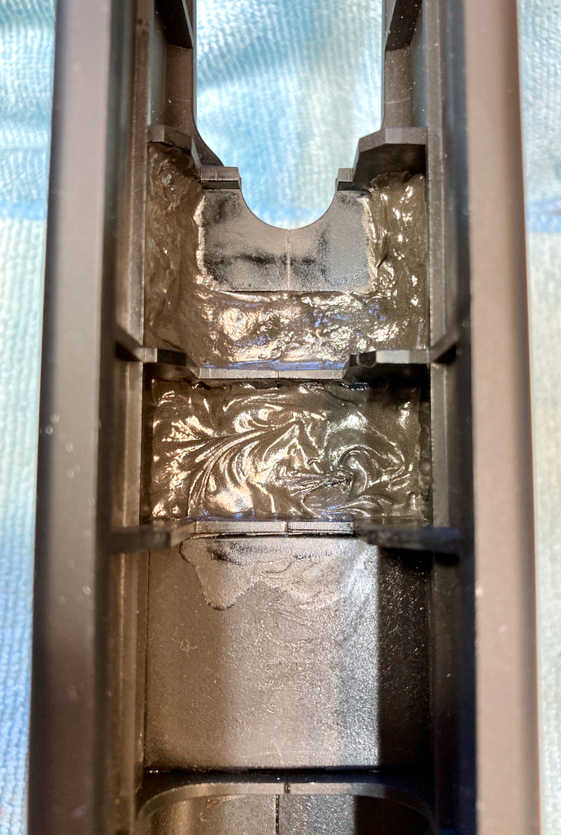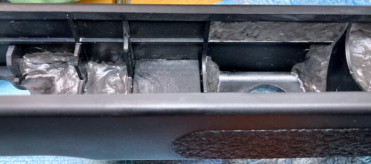 2023年6月10日土曜日 ピラーベディング・ストック補強 M40A5は立派なピラーが付いていて、ストックボルト、トリガーガード、ピラー、レシーバーエンドが実銃と同様にメタルツーメタルコンタクトするようになっています。ピラーが入る部分の周りが空洞になっているのでスチールパテで埋めて、ピラーを固定します。ベディングするには好都合です。